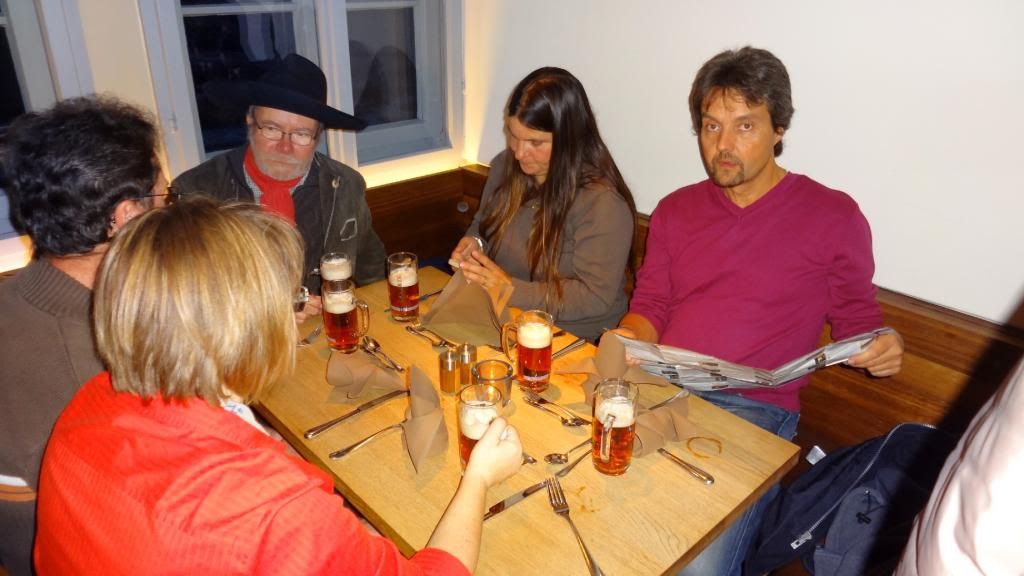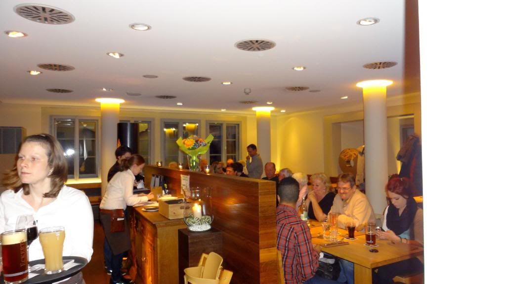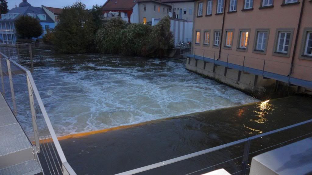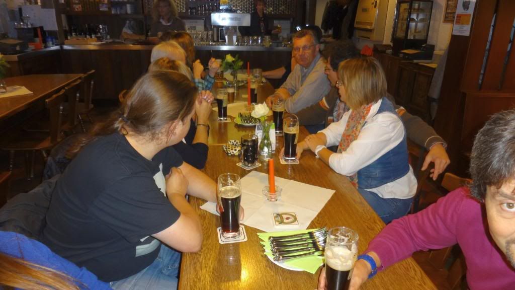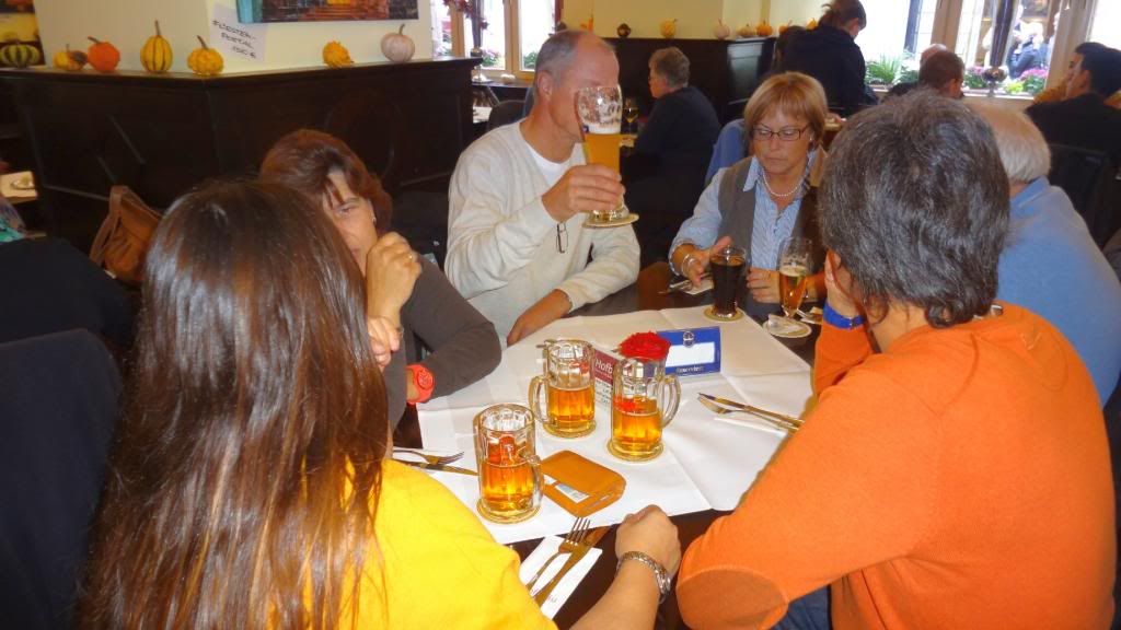 Am späten Nachmittag ging es hinauf zum Cafè Restaurant am Michaelsberg. Dort gab es ein Herrenpils - Biersüppchen mit Bauernbrotcroutons (etwas herb ;-) , dazu Bamberger Bier. Danach absolvierten wir einen unterhaltsamen Spaziergang "rund ums Bier" durch die Altstadt. Unser Guide verstand es mit witzigen Anekdoten und außergewöhnlichen Ein- und Ausblicken die Truppe zu unterhalten. Um kurz vor sieben stoppten wir am Restaurant Eckerts im Hotel Nepomuk. Ein wirklich toll ausgestattetes Gasthaus für gehobene Ansprüche. Direkt am Wehr mit integriertem Unterwasserkraftwerk. Es gab leckeren Schweinerücken an Lagerbiersauce auf Bohnengemüse und Reibekuchen oder Forellenfilet aus dem Biersud mit rissolierten Kartoffeln und Salat , dazu Eckerts Bier und anschließen marinierte Früchte mit Bierschaum überbacken an Landbiereis. Wir probierten auch noch ein sogenanntes "Damenbier", welches einen besonders fruchtigen Geschmack hat. Wobei zu bemerken ist, dass der Braumeister in diesem Haus eine Frau ist.