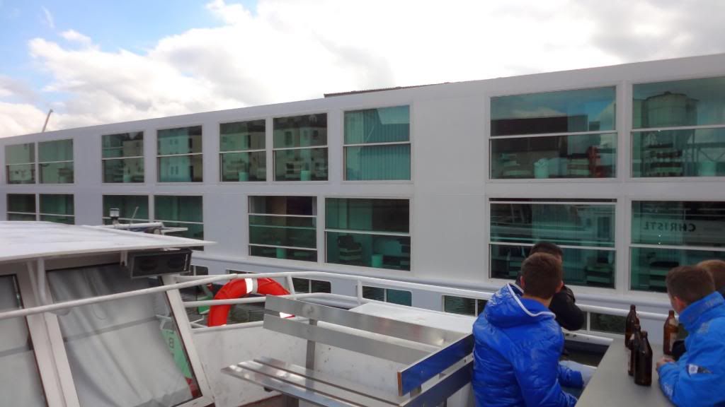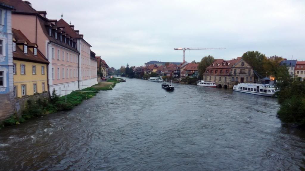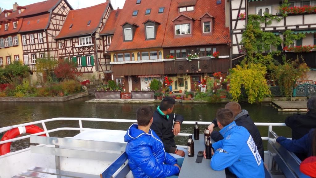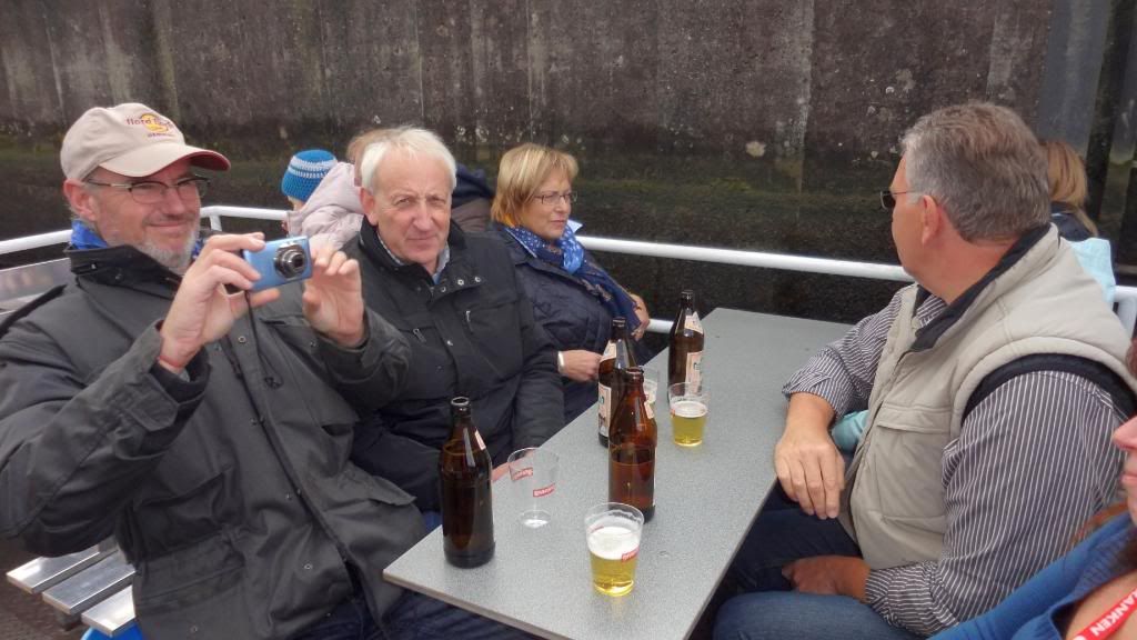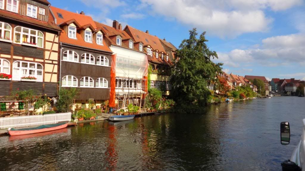 Gut gestärkt absolvierten wir am Nachmittag eine Schifffahrt auf der Regnitz und dem Main-Donau Kanal. Beim Ablegen des Schiffes am Kranen kam pünktlich die Sonne raus. Nun ging es zunächst ein Stück durch die Stadt mit Blick auf Klein-Venedig mit den attraktiven, kleinen Fischerhäuschen am Fluss. Wir fuhren weiter die Regnitz abwärts bis zur Kleinschleuse bei Gaustadt, dann auf der Großschifffahrtsstraße Rhein-Main-Donau-Kanal in den Hafen von Bamberg. Dort sahen wir größere Verladeinrichtungen und zwei Flußkreuzfahrtschiffe. Nach der Rückkehr genehmigten wir uns noch zwei Bockbiere beim Schlenkerla. Das hatten wir am Abend zuvor nicht geschafft. Dann ging es gutgelaunt mit dem Bus zurück. Derweil unterhielten uns unsere jungen Leute stilsicher mit Gassenhauern wie "Bamberg ist nur einmal im Jahr". Wohlbehalten sind wir gegen 20 Uhr in Mockstadt angekommen, einig dass wir wieder mal eine Fahrt mit Übernachtung mit dem Verein machen wollen.