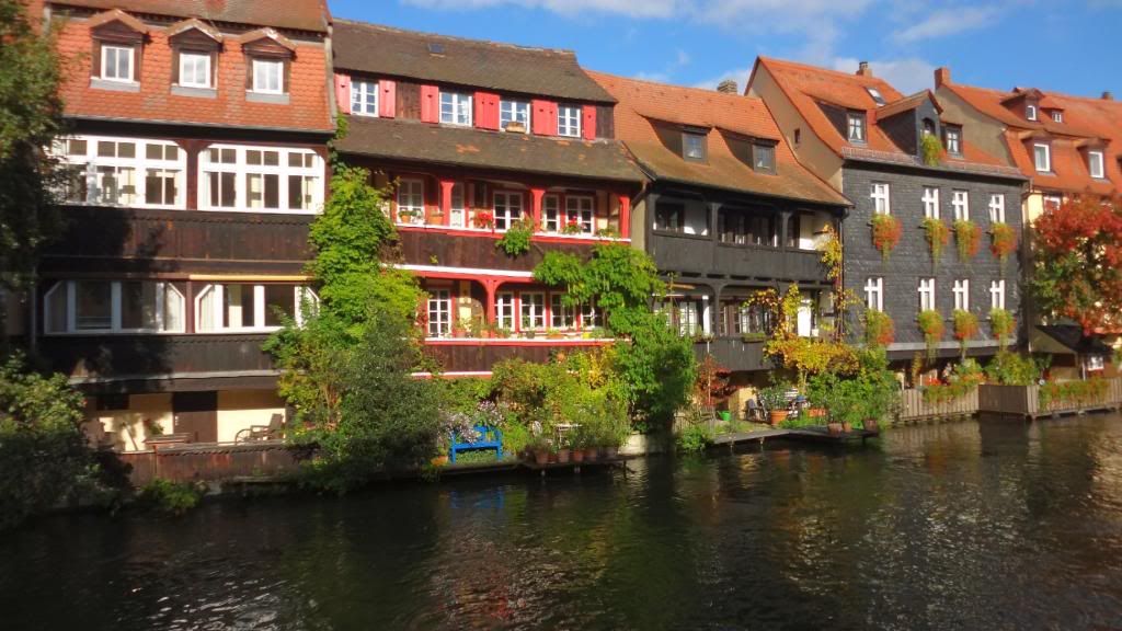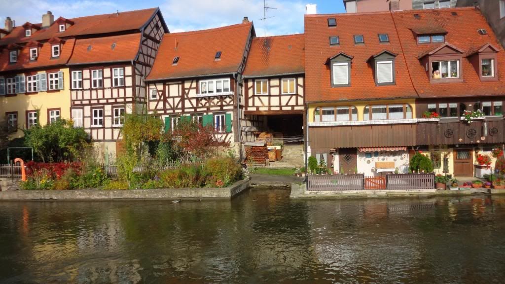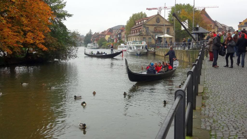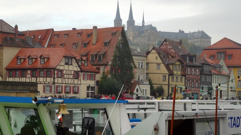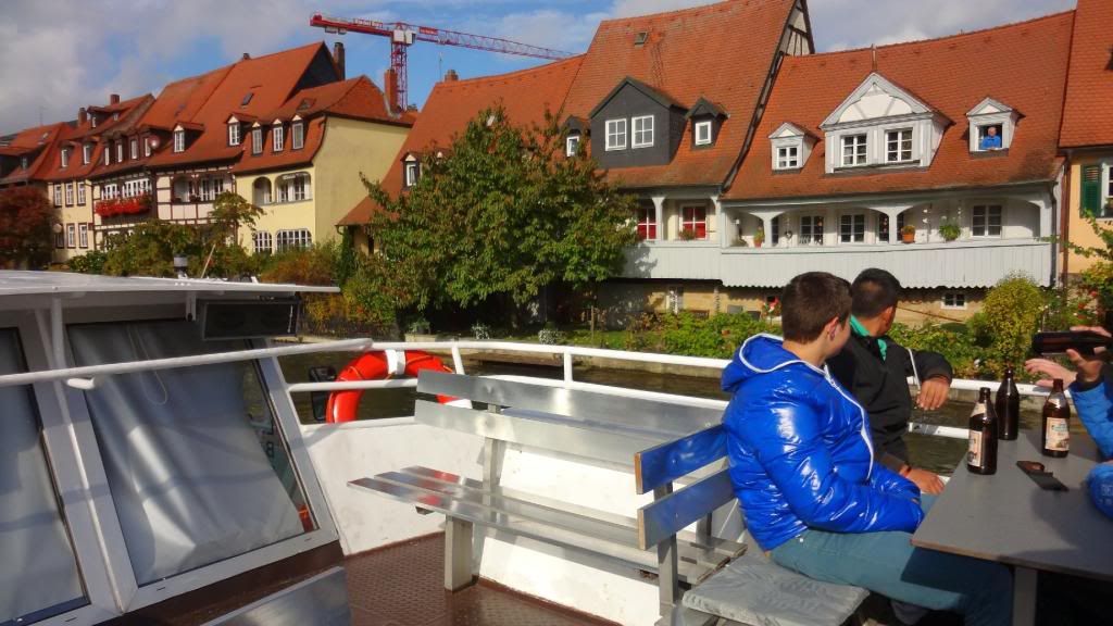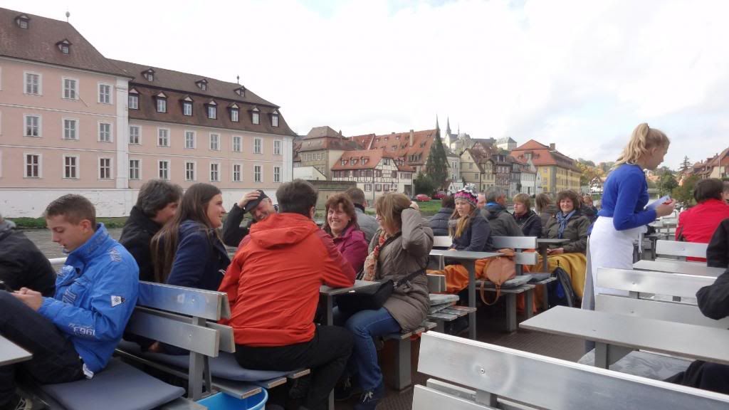 Gut gestärkt absolvierten wir am Nachmittag eine Schifffahrt auf der Regnitz und dem Main-Donau Kanal. Beim Ablegen des Schiffes am Kranen kam pünktlich die Sonne raus. Nun ging es zunächst ein Stück durch die Stadt mit Blick auf Klein-Venedig mit den attraktiven, kleinen Fischerhäuschen am Fluss. Wir fuhren weiter die Regnitz abwärts bis zur Kleinschleuse bei Gaustadt, dann auf der Großschifffahrtsstraße Rhein-Main-Donau-Kanal in den Hafen von Bamberg. Dort sahen wir größere Verladeinrichtungen und zwei Flußkreuzfahrtschiffe. Nach der Rückkehr genehmigten wir uns noch zwei Bockbiere beim Schlenkerla. Das hatten wir am Abend zuvor nicht geschafft. Dann ging es gutgelaunt mit dem Bus zurück. Derweil unterhielten uns unsere jungen Leute stilsicher mit Gassenhauern wie "Bamberg ist nur einmal im Jahr". Wohlbehalten sind wir gegen 20 Uhr in Mockstadt angekommen, einig dass wir wieder mal eine Fahrt mit Übernachtung mit dem Verein machen wollen.