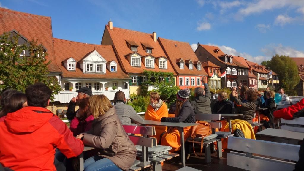 Am späten Nachmittag ging es hinauf zum Cafè Restaurant am Michaelsberg. Dort gab es ein Herrenpils - Biersüppchen mit Bauernbrotcroutons (etwas herb ;-) , dazu Bamberger Bier. Danach absolvierten wir einen unterhaltsamen Spaziergang "rund ums Bier" durch die Altstadt. Unser Guide verstand es mit witzigen Anekdoten und außergewöhnlichen Ein- und Ausblicken die Truppe zu unterhalten. Um kurz vor sieben stoppten wir am Restaurant Eckerts im Hotel Nepomuk. Ein wirklich toll ausgestattetes Gasthaus für gehobene Ansprüche. Direkt am Wehr mit integriertem Unterwasserkraftwerk. Es gab leckeren Schweinerücken an Lagerbiersauce auf Bohnengemüse und Reibekuchen oder Forellenfilet aus dem Biersud mit rissolierten Kartoffeln und Salat , dazu Eckerts Bier und anschließen marinierte Früchte mit Bierschaum überbacken an Landbiereis. Wir probierten auch noch ein sogenanntes "Damenbier", welches einen besonders fruchtigen Geschmack hat. Wobei zu bemerken ist, dass der Braumeister in diesem Haus eine Frau ist.